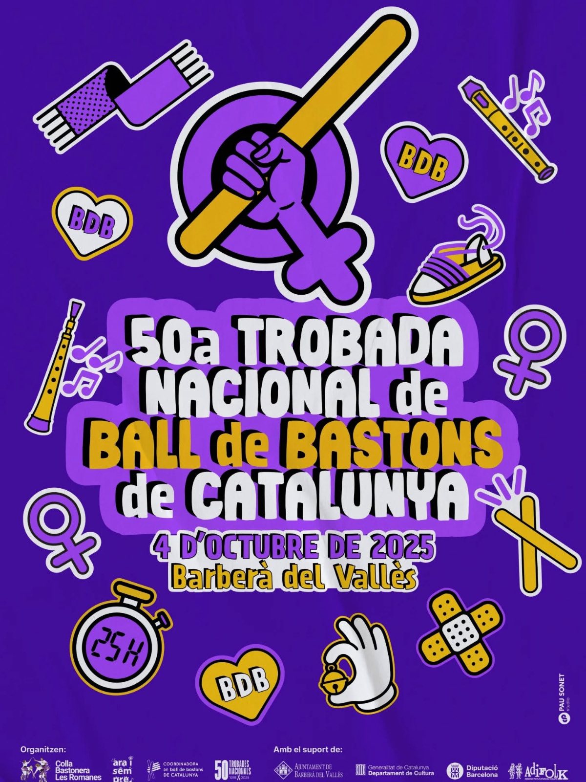 Volem destacar que era la 50a. Trobada i que el cartell és obra del nostre bastoner i il·lustrador Pau Sonet Martínez, qui “ha sabut representar amb força i sensibilitat tot allò que representa aquesta trobada: una gran festa del ball de bastons, de l’emoció compartida i del futur que construïm entre totes”, en paraules dels organitzadors.