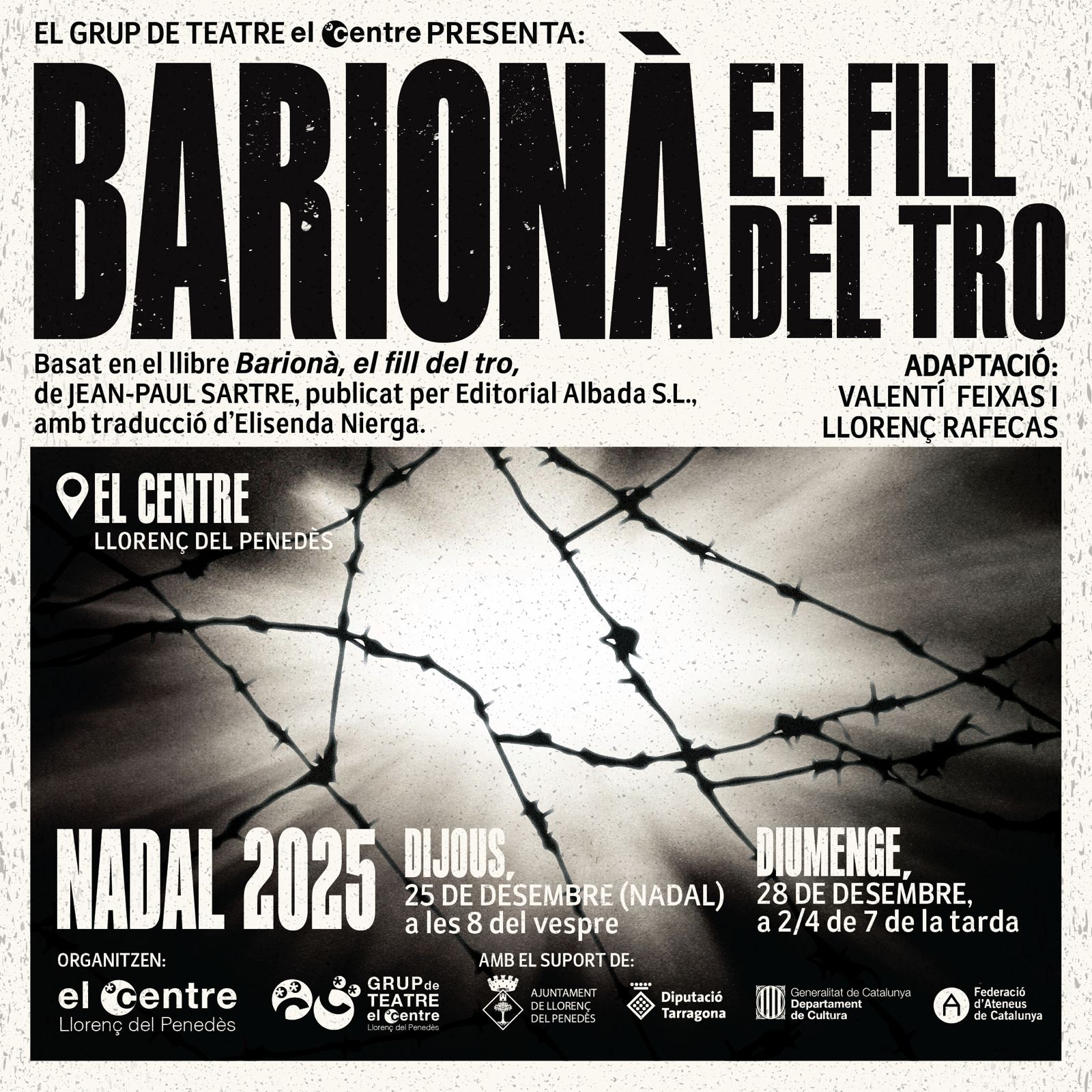 El 𝗚𝗿𝘂𝗽 𝗱𝗲 𝗧𝗲𝗮𝘁𝗿𝗲 𝗱𝗲𝗹 𝗖𝗲𝗻𝘁𝗿𝗲 presenta una estrena absolutament única a Catalunya: 𝗕𝗮𝗿𝗶𝗼𝗻𝗮̀, 𝗲𝗹 𝗳𝗶𝗹𝗹 𝗱𝗲𝗹 𝘁𝗿𝗼, una obra gairebé desconeguda de Jean-Paul Sartre, escrita l’any 1940 en plena II Guerra Mundial des d’un camp de presoners a Alemanya, 𝗯𝗮𝘀𝗮𝗱𝗮 𝗲𝗻 𝗲𝗹 𝗹𝗹𝗶𝗯𝗿𝗲 𝗙𝗶𝗹𝗹 𝗱𝗲𝗹 𝘁𝗿𝗼, 𝗽𝘂𝗯𝗹𝗶𝗰𝗮𝘁 𝗽𝗲𝗿 𝗘𝗱𝗶𝘁𝗼𝗿𝗶𝗮𝗹 𝗔𝗹𝗯𝗮𝗱𝗮 𝗦.𝗟. 𝗮𝗺𝗯 𝘁𝗿𝗮𝗱𝘂𝗰𝗰𝗶𝗼́ 𝗱’𝗘𝗹𝗶𝘀𝗲𝗻𝗱𝗮 𝗡𝗶𝗲𝗿𝗴𝗮. L’obra és una història de ficció que passa simultàniament a la narració dels evangelis del naixement de Jesús. No deixa de ser sorprenent que algú, confessadament ateu, escrigui un text situat a l’entorn d’aquest episodi central del cristianisme. Ho fa barrejant-ho i confrontant-ho amb el seu propi pensament filosòfic. L’obra es va estrenar el Nadal del 1940 al propi camp de presoners i interpretat per alguns d’ells mateixos. Després se’n va perdre la pista, amb alguna excepció puntual, i no és fins l’any 2024 que es va publicar per primera vegada en català, a partir d’un exemplar trobat a la Universitat d’Indiana, als Estats Units. El Grup de Teatre oferirà una lectura dramatitzada (fortament dramatitzada) de l’obra, amb més d’una trentena d’actors i actrius i amb acompanyament de música i imatges audiovisuals. Cal dir que el text és molt potent, fa reflexionar i té, sorprenentment, elements que ens fan pensar en el món d’avui en dia. No us podeu perdre aquesta primícia!